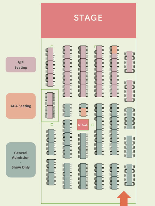 VIP Seating: Includes full buffet dinner, 2 additional cocktails and seating closest to the stage